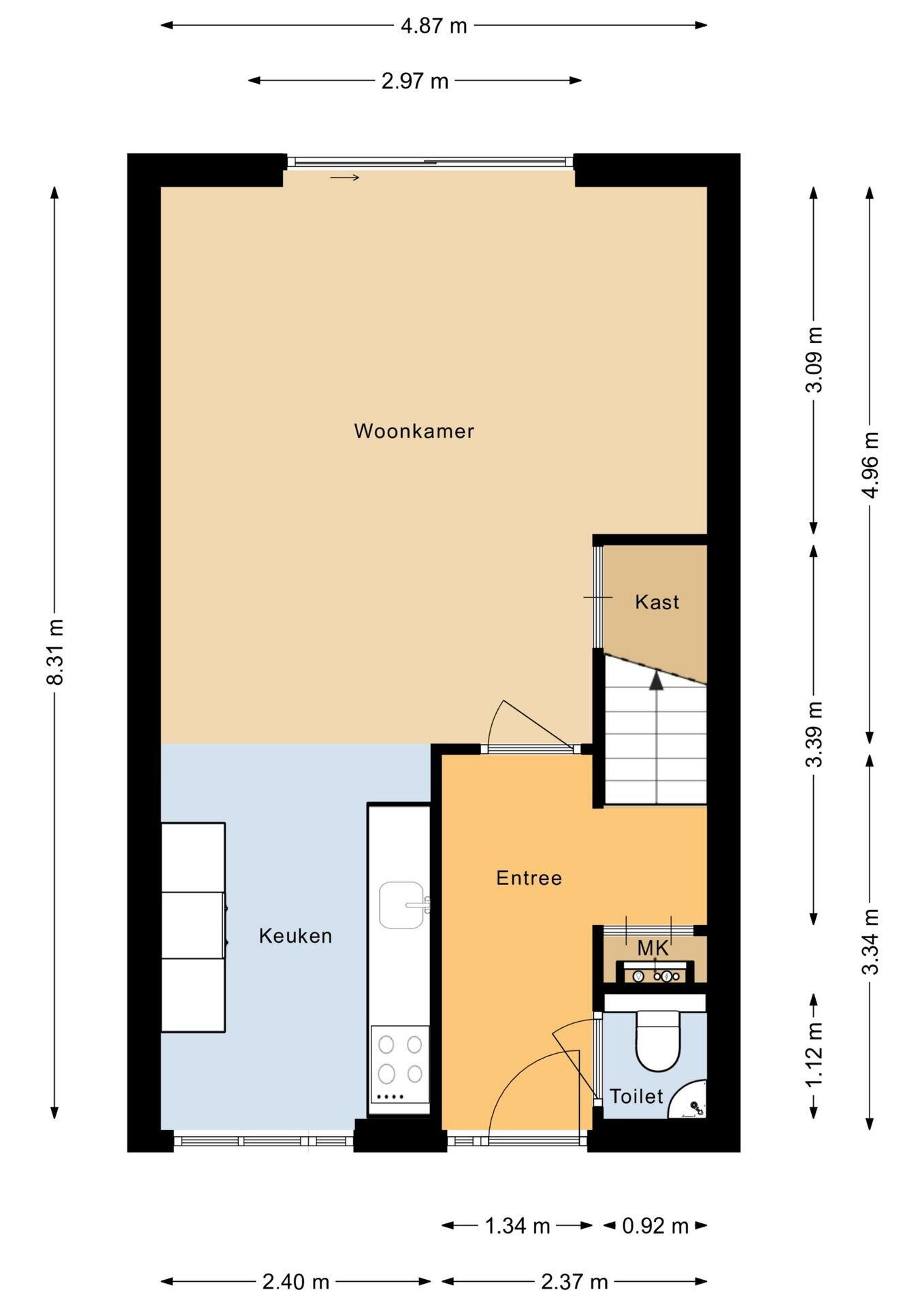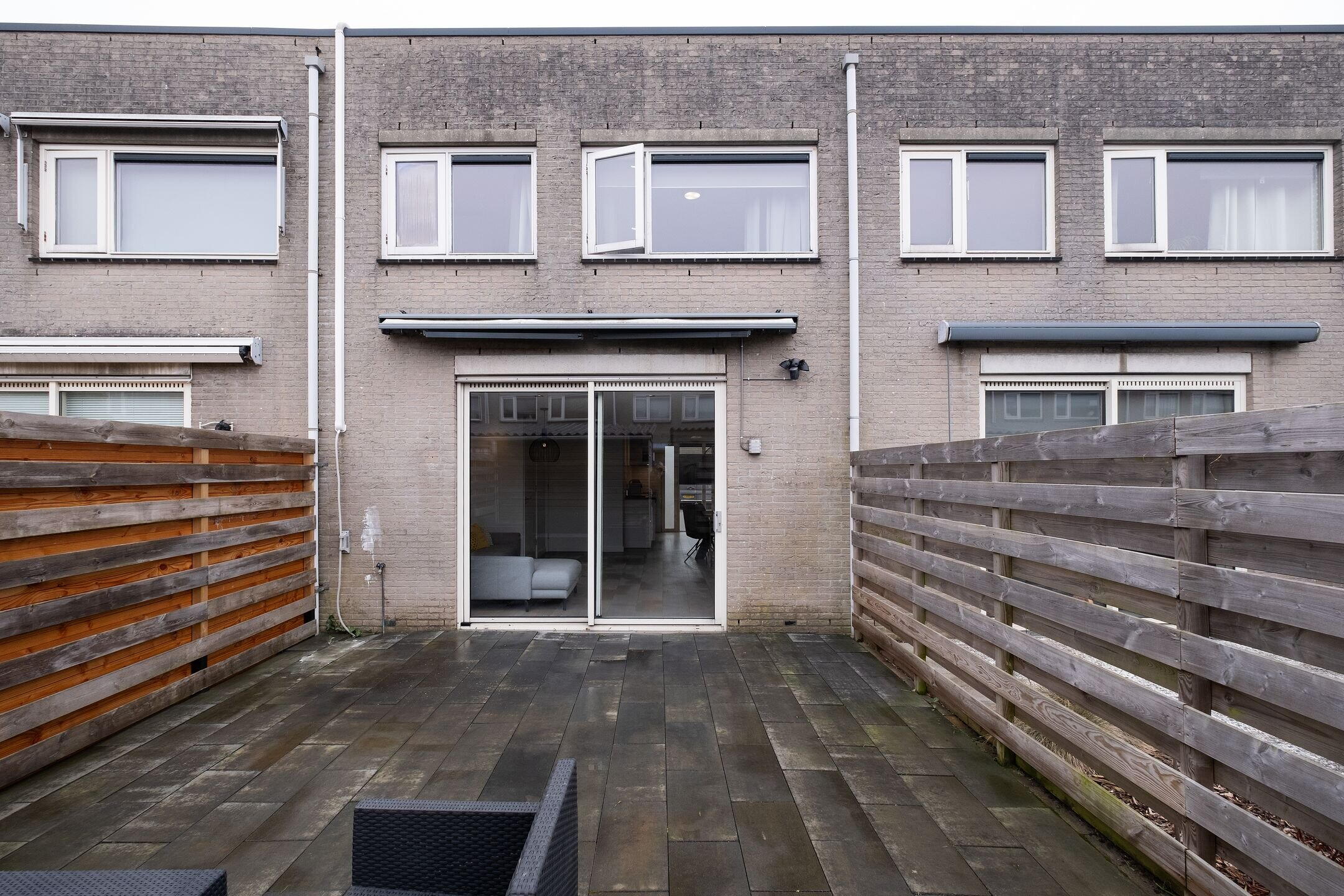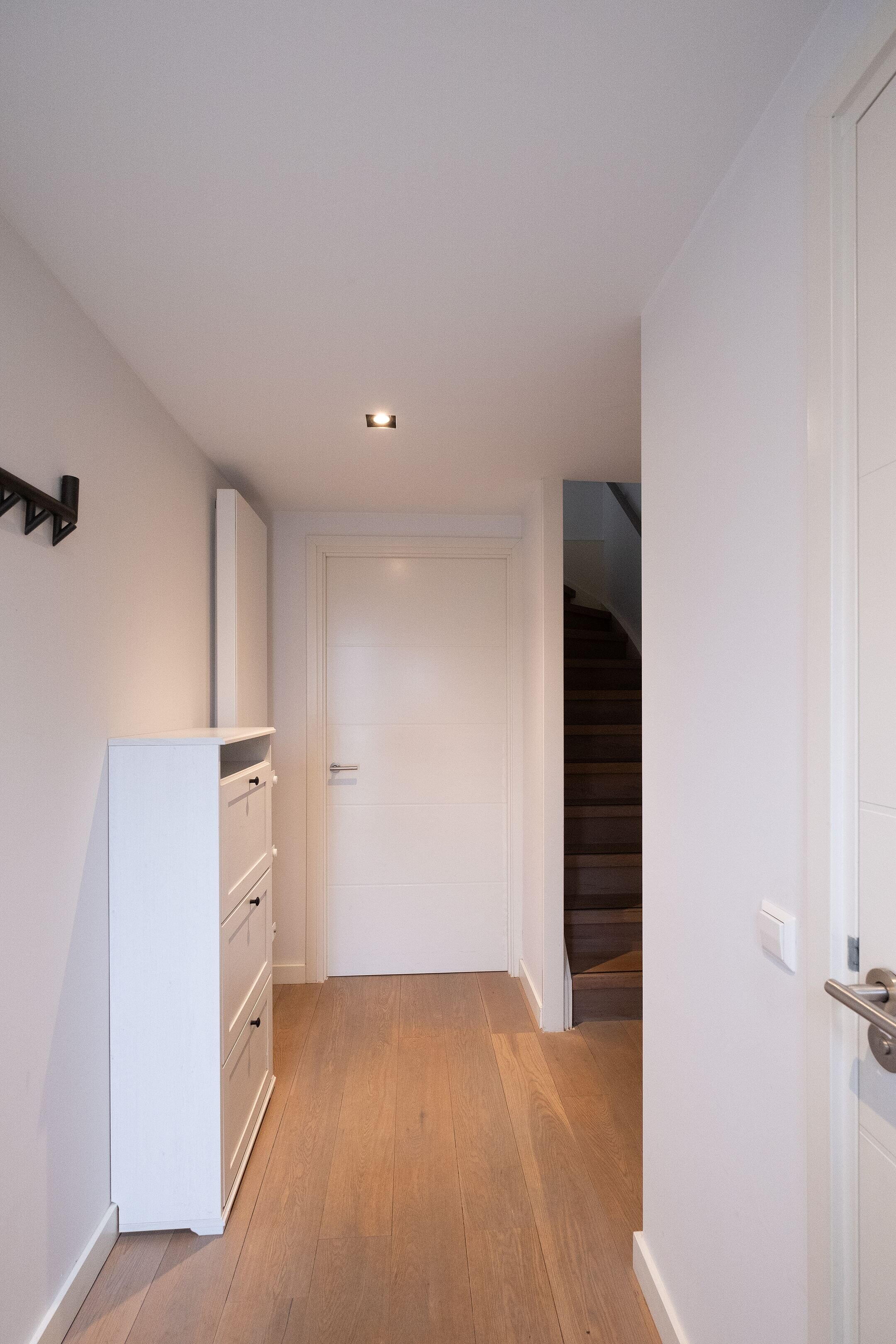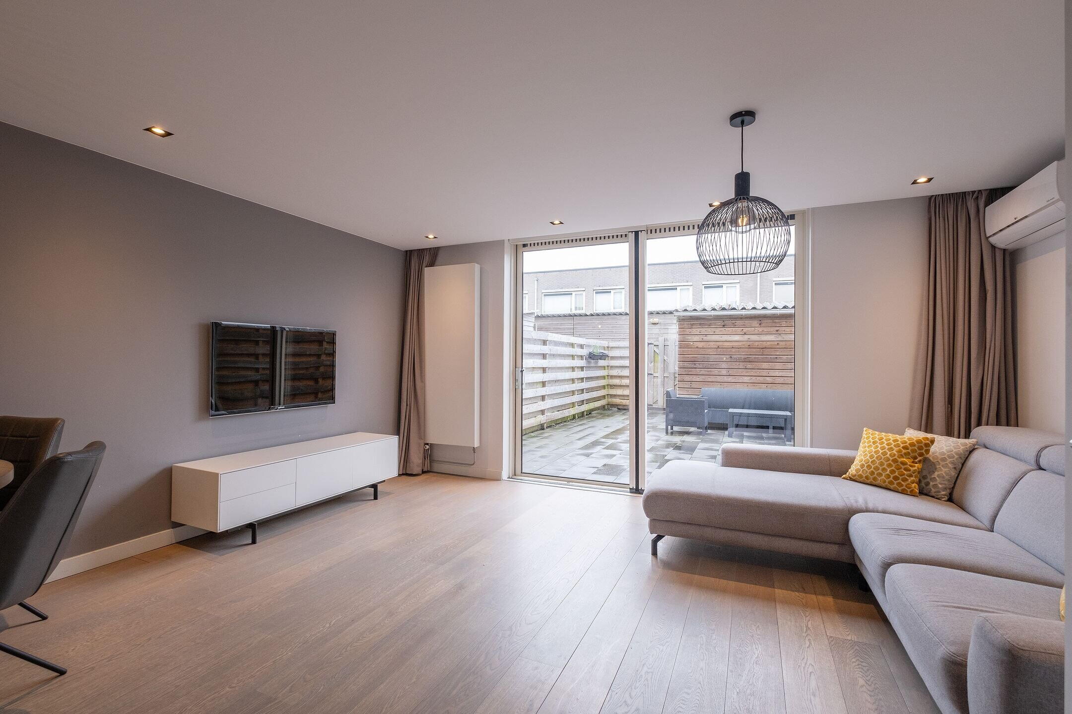 Onder de trap bevindt zich een handige voorraadkast. Extra comfort wordt geboden door de airco in de woonkamer. Via de schuifpui stap je zo de zonnige achtertuin in.