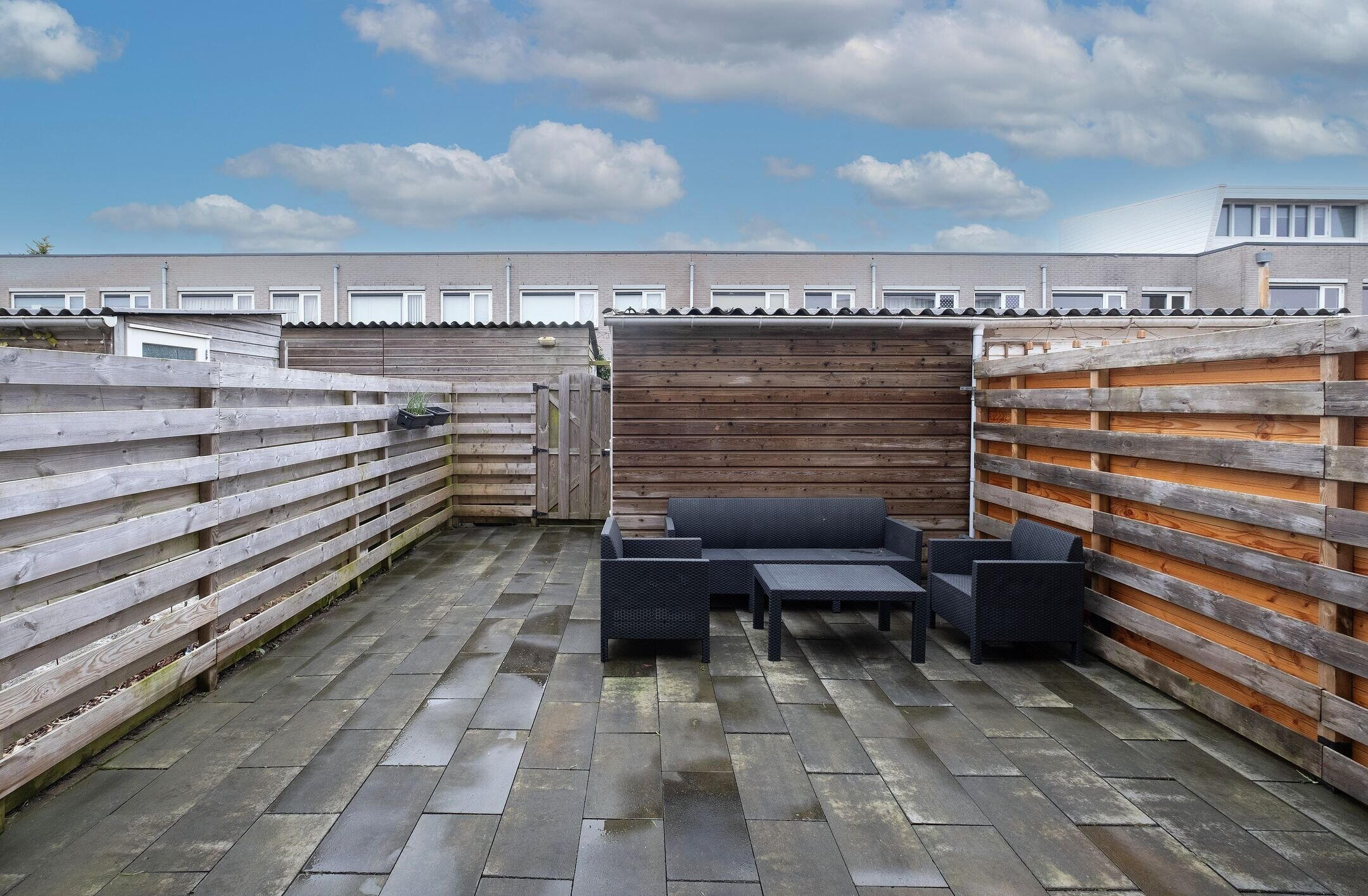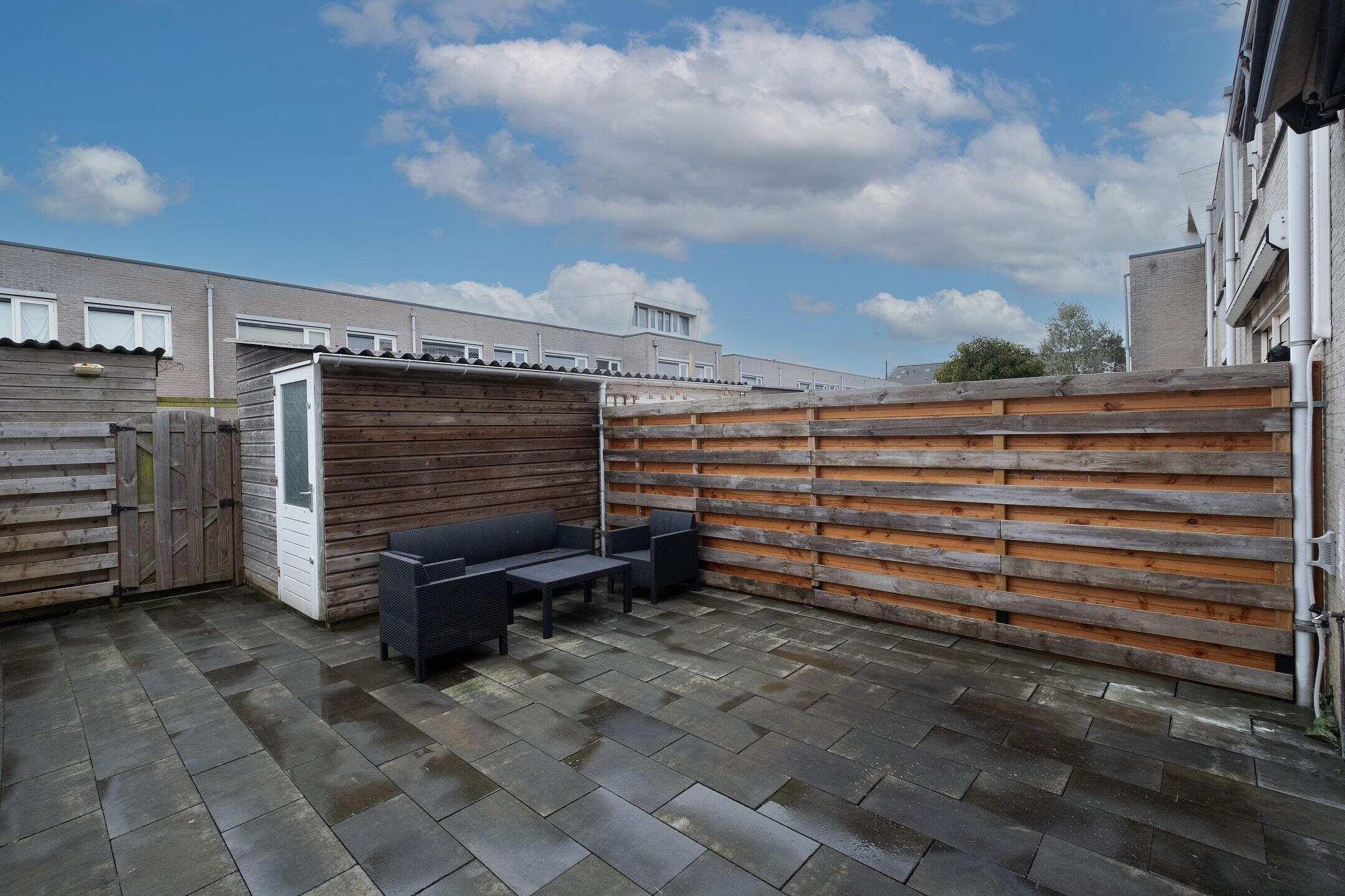 De verzorgde achtertuin ligt gunstig op het zuidwesten, waardoor je hier vanaf de late ochtend tot in de avond van de zon geniet. De tuin is voorzien van een zonnescherm, een achterom en een houten berging voor fietsen en tuinspullen.